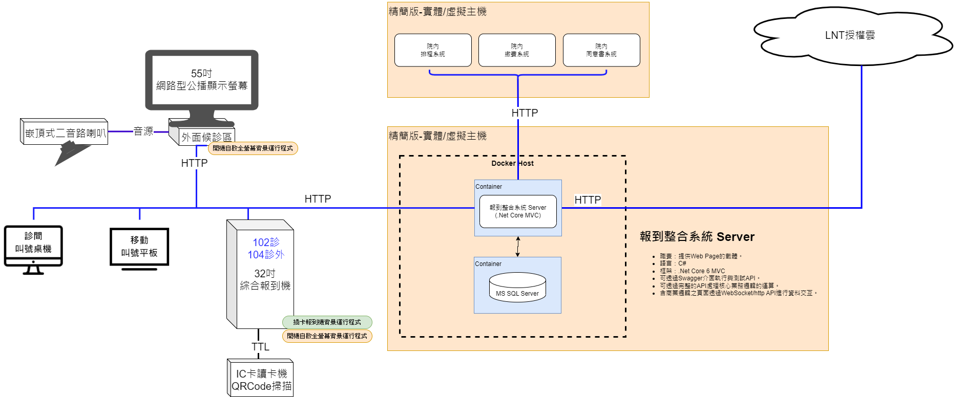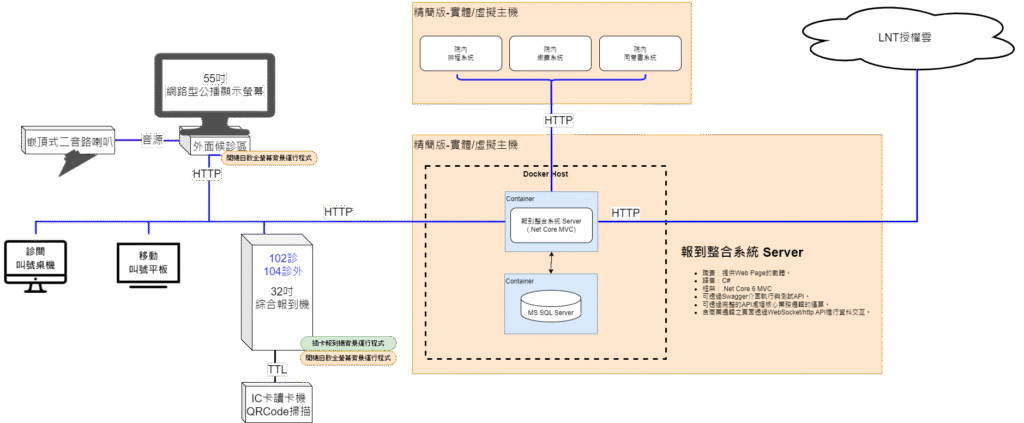 彰基乳外超科室-智能報到系統案例架構設計 彰基乳外超系統架構 院內系統介接: 院內排程系統 院內繳費系統 院內同意書系統 實體/虛擬主機: 報到整合系統 Server(.Net Core MVC) MS SQL Server 整合設備: 報到機-隨附電腦 公播螢幕-隨附電腦